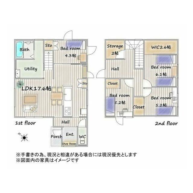 | 間取り(内訳) | 4SLDK(LDK17.6、洋4.3、5.2、5.2、6.1、S2) | 建物面積 | 107.98㎡ |